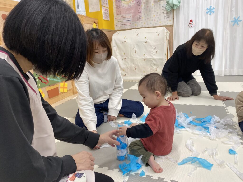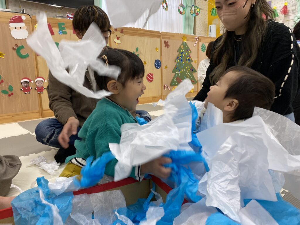 花紙を雪に見立てて、ちぎったり、丸めたり、集めて降らせたり❄️